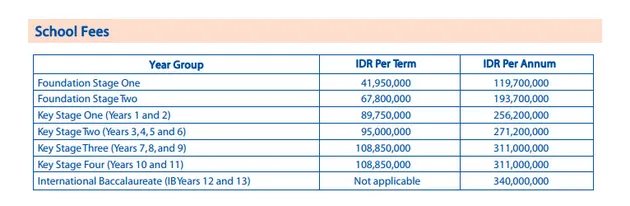Semakin tinggi tingkat pendidikan, bayaran setiap tahunnya yang harus dibayar dalam sekali tagihan semakin besar. Setidaknya, untuk sekolah dari setaraf SD kelas 1 hingga kelas 6 harus memakan biaya hampir Rp 1,6 miliar. Biaya ini belum termasuk daftar ulang, ekstrakulikuler, dan juga bus sekolah.
