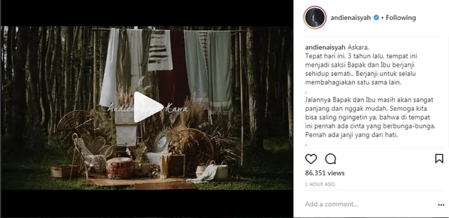 Pada peringatan ulang tahun pernikahannya, Andien & Ippe membagikan video menyentuh. Mereka juga menyelipkan caption yang mengharukan tenatang pernikahan, cinta, dan keluarga.