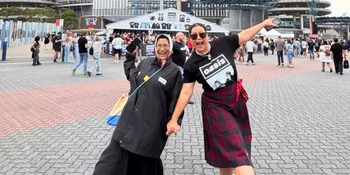 Inilah potret Okky Lukman dan sang ibu, Zukaida Hassan, nonton konser OASIS di Sydney. Ibu dan anak selebriti ini tampak mengabadikan momen di depan Accor Stadium.