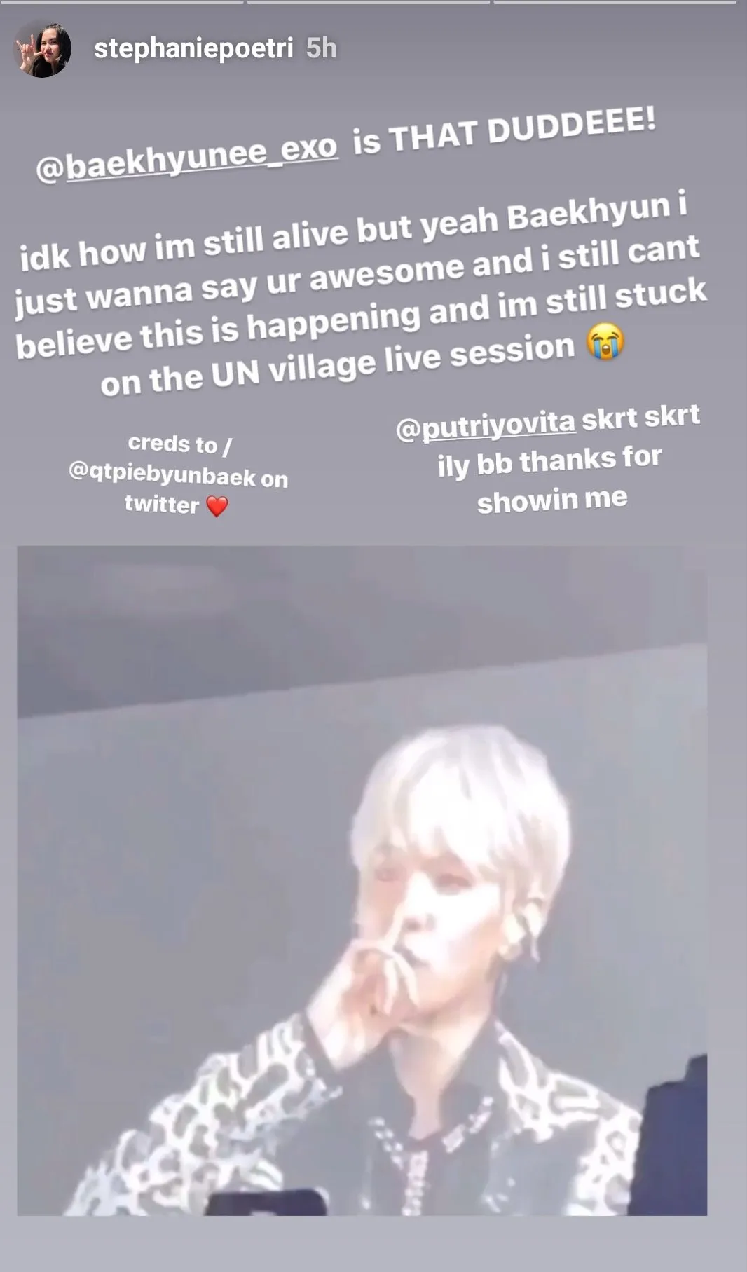 Tak cukup sampai di situ, Stephanie masih membuat beberapa kicauan berikutnya untuk menyampaikan rasa bahagia gara-gara Baekhyun. Ia juga bilang kalau dulu nggak suka K-Pop, lalu saat SMA jadi suka lagu Call Me Baby-nya EXO dan sekarang dia kecanduan Ko Ko Bop (juga lagu EXO). Gadis yang biasa disapa Menik ini juga posting di IG story soal Baekhyun dan masih tak percaya karena lagunya dinyanyikan oleh sang idola.