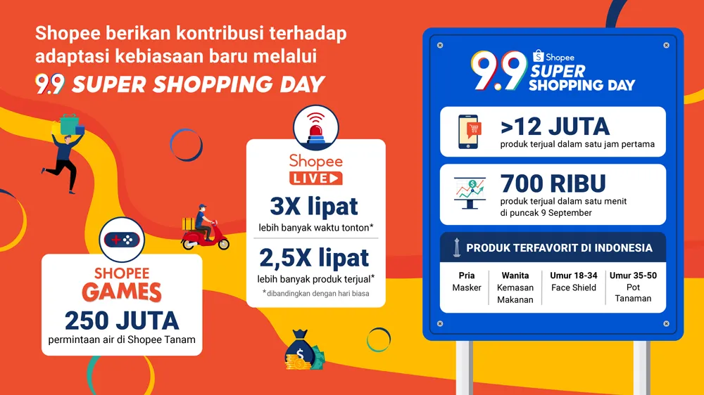 9.9 Super Shopping Day diibaratkan sebagai batu loncatan pemulihan ekonomi karena penjual dan mitra brand di seluruh wilayah dapat memaksimalkan visibilitas dan penjualan mereka di Shopee. Ada 700 ribu produk terjual dalam satu menit pada puncak 9 September.