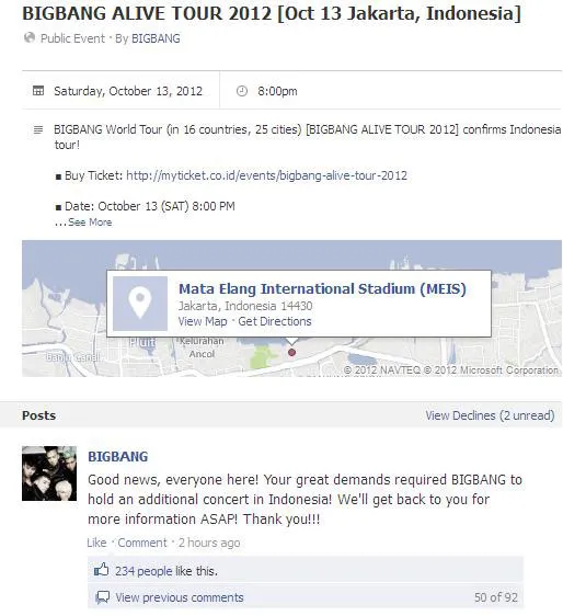Berita itu sendiri muncul dalam Facebook resmi Big Bang di mana mereka mengungkapkan, "Berita bagus untuk semua orang! Lantaran tingginya permintaan, kemungkinan konser Big Bang di Indonesia akan ditambah! Kami akan segera kembali untuk informasi lebih lanjut secepatnya. Terima kasih!"