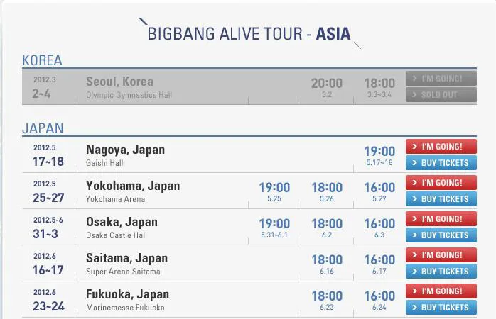 Konser Big Bang yang sudah dimulai pada 2-4 Maret lalu di Korea Selatan itu akan berlanjut di lima kota di Jepang yakni di Nagoya, Yokohama, Osaka, Saitama, dan Fukuoka pada Mei-Juni nanti.