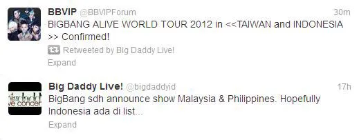Usai menanti dengan galau, VIP (fans Big Bang) patut berbahagia lantaran Big Bang yang akan menggelar tur ALIVE sudah mengkonfirmasi Indonesia sebagai salah satu negara tujuan melalui situs Facebook resmimereka.