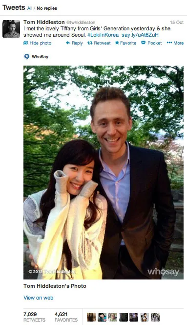 Baru-baru ini Tom berkunjung ke Korea Selatan dalam rangka promosi film sekuel Thor yang berjudul THOR: THE DARK WORLD. Selama di Korea, Tom tampil di program Mnet yakni Wide Open Studio dengan MC si cantik member idol grup Girls Generation, Tiffany.