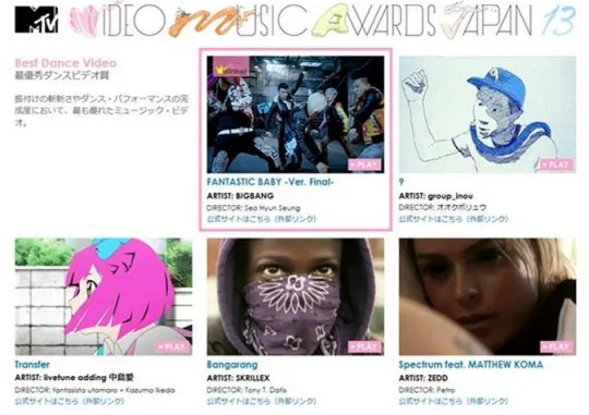 Terbaru, boyband Big Bang meraih award untuk Best Dance Video dalam ajang MTV VMAJ 2013. Big Bang meraih hasil itu melalui MV yang berjudul Fantastic Baby, seperti dilansir soompi.com.