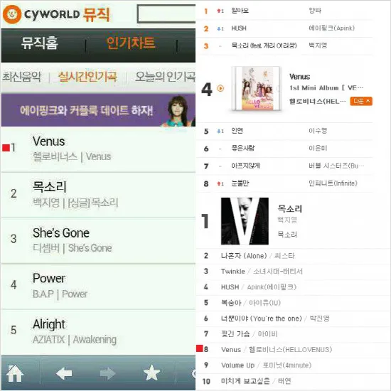 Bahkan Venus ada di posisi pertama dari chart musik Cyworld, posisi ke-4 di chart Bugs dan posisi ke-8 di update chart musik Mnet.