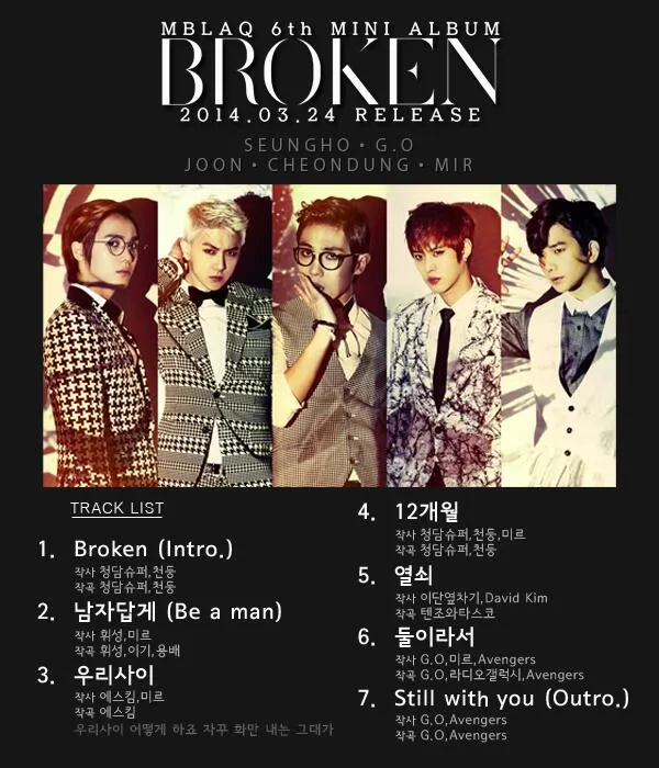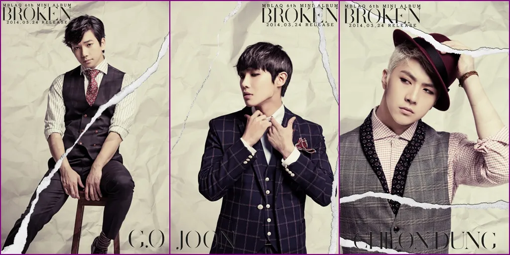 Kapanlagi.com - Idol grup MBLAQ akhirnya merilis teaser foto individu sekaligus daftar lagu untuk mini album terbaru mereka, BROKEN melalui Twitter resmi agensi mereka.Dalam teaser foto member yang dirilis, MBLAQ memilih tampil berkelas dan vintage untuk penampilan maskulin mereka yang sangat keren. Dua member termuda MBLAQ, Mir dan Cheondung (Thunder) tampil sangat manly.