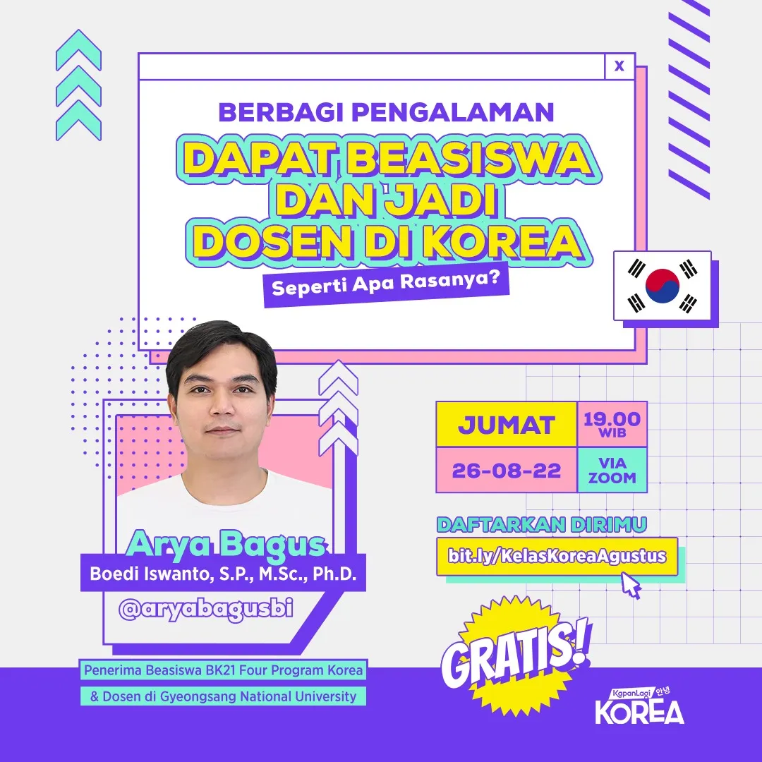 Bareng Arya Bagus Boedi Iswanto, S.P., M.Sc., Ph.D. - Penerima beasiswa BK21 Four Program Korea & Dosen di Gyeongsang National University, kamu bakal diajak mengenal lebih lanjut seperti apa proses untuk mendapatkan beasiswa ke Korea hingga bisa kerja di sana.