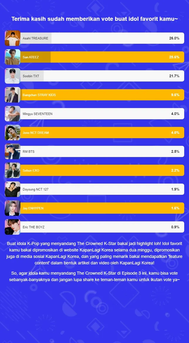 Terima kasih sudah melakukan vote CROWN YOUR K-STAR, sampai jumpa di polling selanjutnya. Sekali lagi selamat untuk Asahi TREASURE dan TEUME!