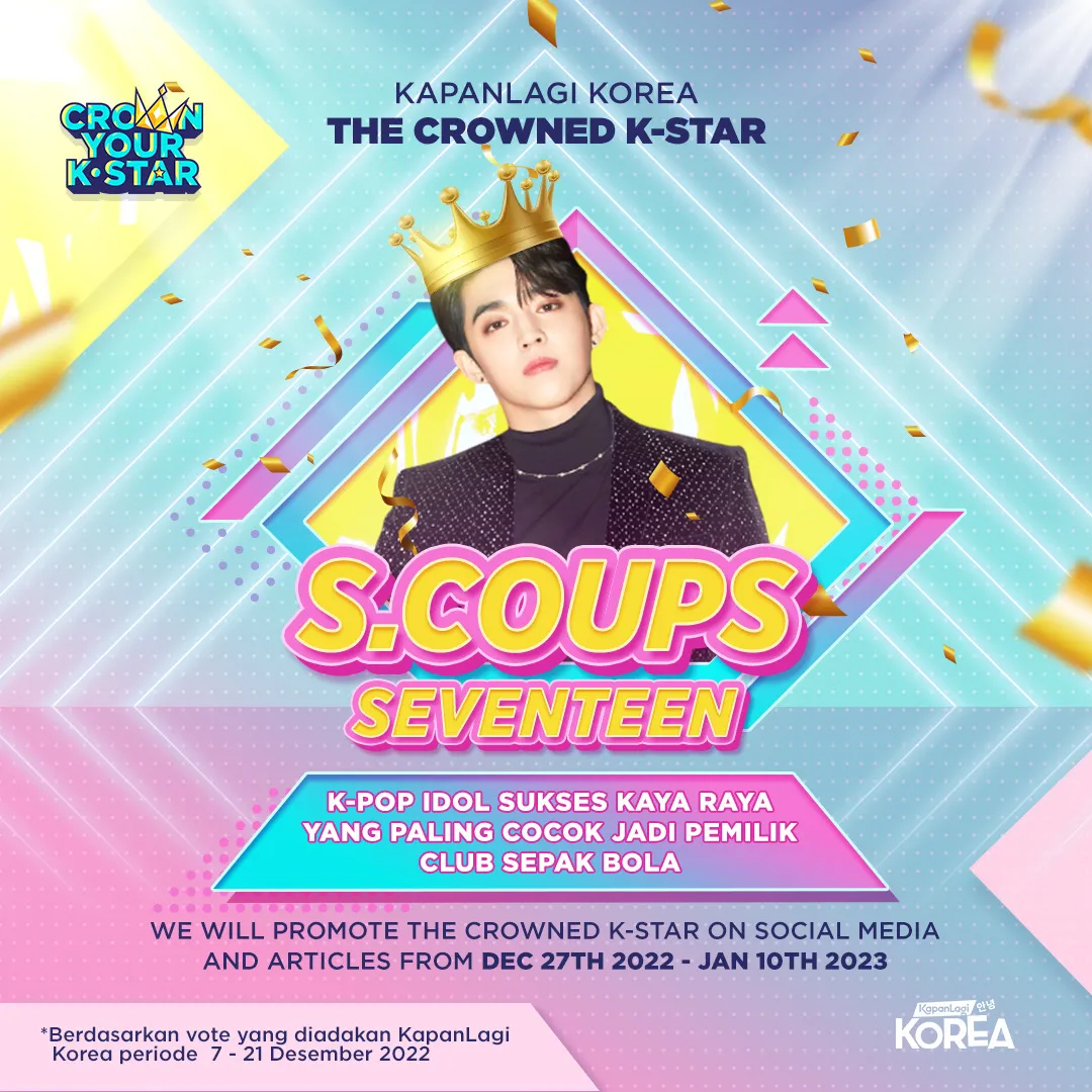 Sebagai THE CROWNED K-STAR, S.Coups SEVENTEEN akan dipromosikan di website KapanLagi.com selama dua minggu melalui banner (ditayangkan bergantian dengan banner lain di web), dipromosikan juga di media sosial KapanLagi Korea, dan yang paling menarik bakal mendapatkan 'featured content' dalam bentuk artikel!