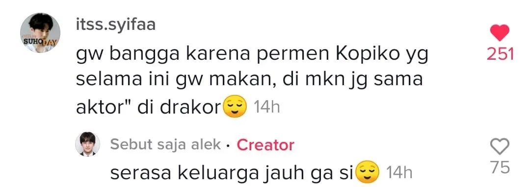 "Gue bangga karena permen Kopiko yang selama ini gue makan, dimakan juga sama aktor-aktor di drakor," ujar dari pemilik akun Tik Tok @itss.syifaa.