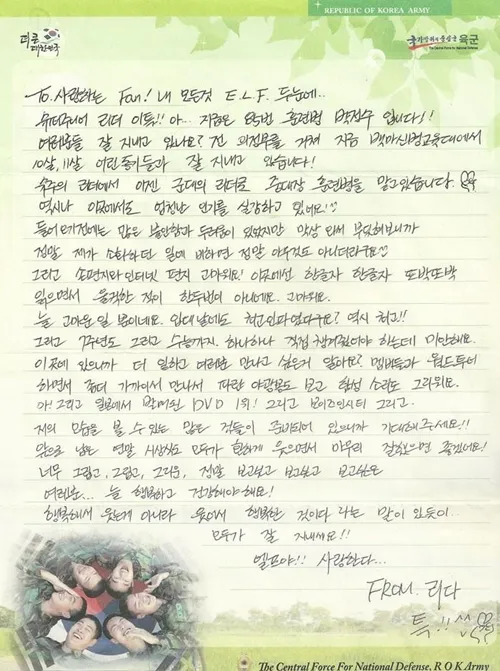 "Untuk seluruh penggemarku yang kucintai! ELF yang luar biasa...Aku Leeteuk, leader Super Junior! Ah, tapi aku ada di kesatuan ke-85, jadi sekarang aku adalah Park Jung Soo! Bagaimana kabar kalian? Aku sudah melewati Euijungboo dan sekarang ada di White Horse RTC (Pusat Pelatihan Kesatuan) dan aku melewati waktu menyenangkan dengan prajurit lain yang 10, 11 tahun lebih muda dariku!Aku meninggalkan posisi leader Super Junior dan kini menjadi leader dalam kesatuanku. Bahkan di sini, aku merasa banyak dikenali orang.^^ Sebelum datang di sini, aku sangat gugup dan takut, tapi sekarang aku menyadari bahwa tak banyak yang berubah dari sebelumnya.^^ Terima kasih kalian sudah menulis surat untukku! Aku membaca semua surat-surat itu sampai terkadang menangis. Terima kasih.Aku hanya selalu bersyukur. Kudengar banyak orang yang datang saat aku masuk militer? Kalian memang yang terbaik. Aku seharusnya ikut berpartisipasi dalam perayaan 7 tahun Super Junior, tapi aku minta maaf. Selama aku di sini, aku semakin merindukan kalian. Aku akan merindukan saat tur dunia bersama Super Junior dan melihat lautan sapphire blue lightstick serta mendengar teriakan kalian.Kudengar DVD Super Junior juga dirilis di Jepang dan mencapai posisi pertama! Dan dalam Boys in City kalian bisa melihat diriku juga. Aku harap semua orang bisa bahagia di penghargaan akhir tahun nanti. Aku rindu, rindu, rindu kalian dan sangat, sangat, sangat ingin bertemu dengan kalian. Kalian harus bahagia dan sehat! Seperti yang disebutkan, 'Kau tak tertawa karena kau bahagia, tapi kau bahagia karena kau tertawa. Jadi semuanya, jaga kesehatan!!"Â Â Â ELF!!! Aku mencintaimu....