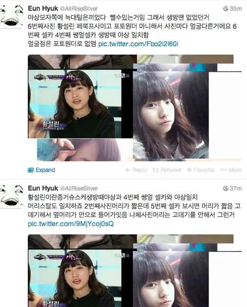 Sang hacker melanjutkan, "Seol Lin menggunakan pelurus rambut untuk membuat poninya bergelombang ke dalam. Namun dalam foto telanjang dia tak memakai gaya rambutnya ini. Foto keenam ini adalah gambar di Facebook Seol Lin. Dia memakai Photowonder (aplikasi editing gambar di smartphone yang populer di Korea Selatan). Wajahnya memang berbeda di setiap foto, namun wajah selca-nya di foto keenam dan di foto bugilnya sama,"
