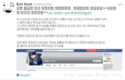 Seakan lelah, Eunhyuk memposting sendiri di Twitter, "Aku tak akan mengungkapkan nama aslimu. Aku merasa bersalah pada sosok wanita yang jadi korban di foto. Aku tak tahu apakah ini karena aku tak bisa mengelola Twitter dengan benar. Namun aku akan berbicara dengan agensi soal ini. Twitter adalah media yang saya gunakan untuk berkomunikasi dengan fans, jadi aku tak akan menghilangkannya. Jadi, aku minta maaf."
