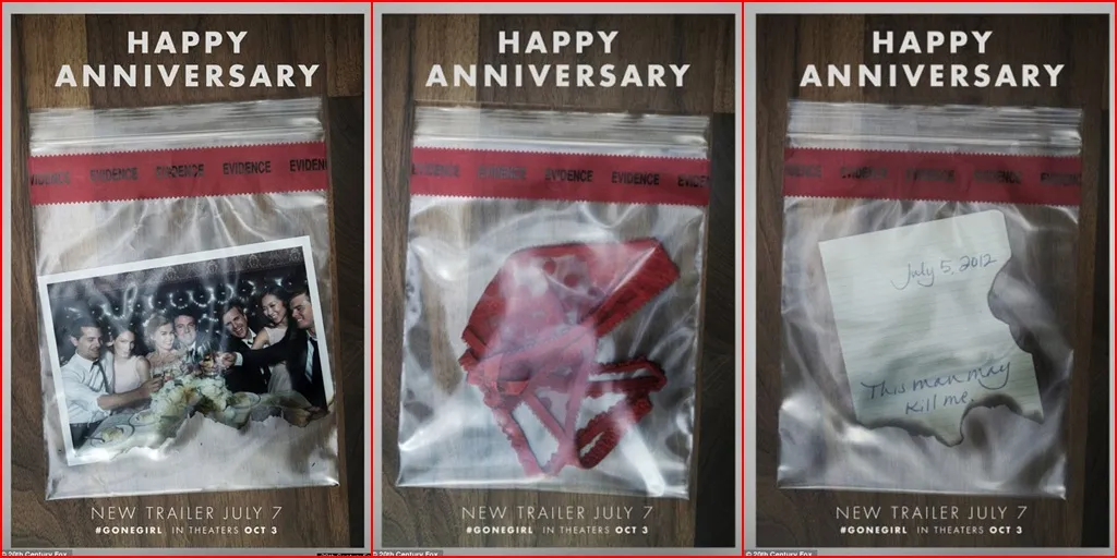 Ada satu foto dari pernikahan Amy dengan Nick Dunne (Ben Affleck) dan yang lain seperti sebuah kertas catatan yang terbakar. Di mana catatan yang memiliki tanggal 5 Juli 2012 itu bertuliskan, 'Pria ini mungkin membunuhku'.