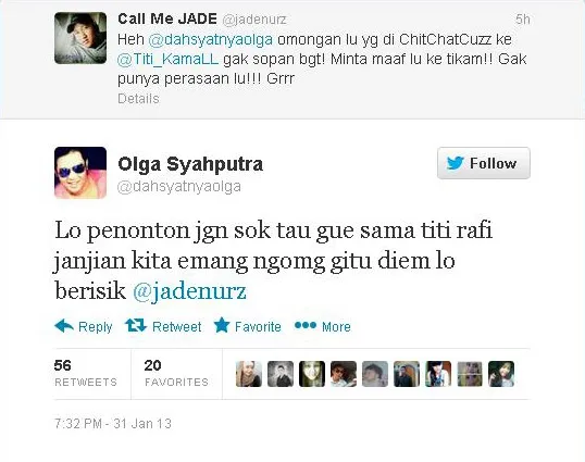 "Heh @dahsyatnyaolga omongan lu yg di ChitChatCuzz ke @Titi_KamaLL gak sopan bgt! Minta maaf lu ke tikam!! Gak punya perasaan lu!!! Grrr," tulis @jadenurz pada Olga dalam akun twitter.
