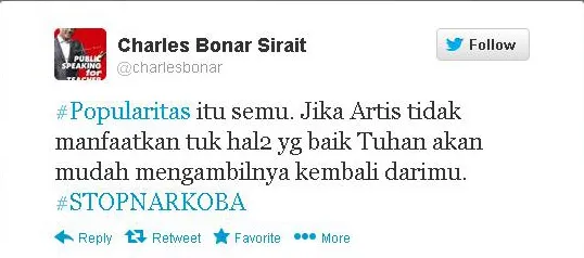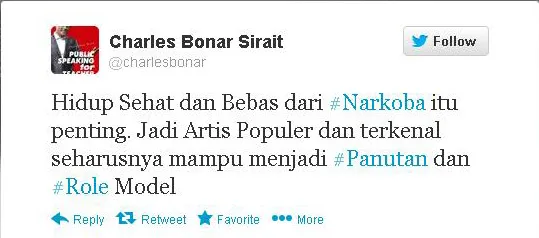 Melalui akun twitternya, @charlesbonar, ia mengungkapkan keinginannya agar selebriti pengguna narkoba tak diberi kesempatan tampil lagi sebagai entertainer karena dianggap tidak pantas.