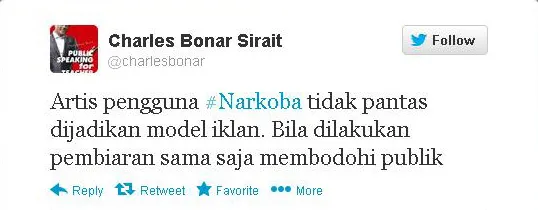 "Artis pengguna #Narkoba tidak pantas dijadikan model iklan. Bila dilakukan pembiaran sama saja membodohi publik," lanjutnya.