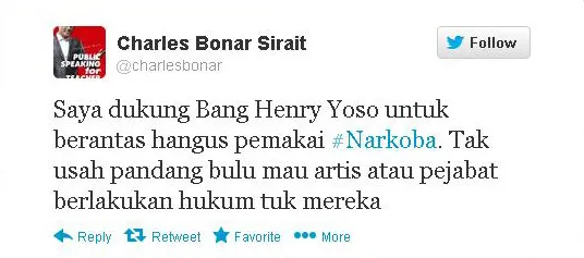 "Saya dukung Bang Henry Yoso untuk berantas hangus pemakai #Narkoba. Tak usah pandang bulu mau artis atau pejabat berlakukan hukum tuk mereka," imbuhnya.