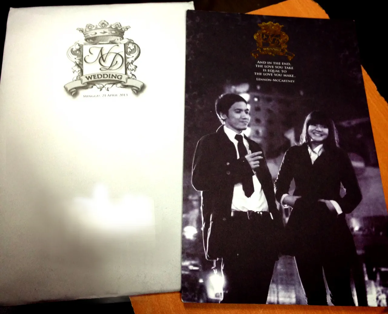 Undangan warna hitam dan putih itu menampilkan dua wajah kedua mempelai yang tengah tersenyum ceria. Pada bagian atas juga menampilkan kalimat bijak berbunyi, "And In The End. The Love You Take Is Equel To The Love You Make... Lennon - McCartney"