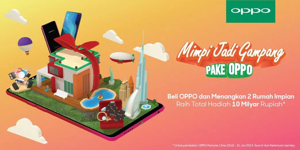 Dream and win! Gambarkan impianmu dan beli produk OPPO selama periode 1 Desember 2018 hingga 31 Januari 2019, kamu akan berkesempatan menangkan Grand Prize 2 rumah impian dan Lucky Draw berhadiah menarik lainnya senilai total 10 Miliar Rupiah. Tunggu apalagi? Bikin #MimpiJadiGampang Pake OPPO! Ikuti info selengkapnya, di sini.