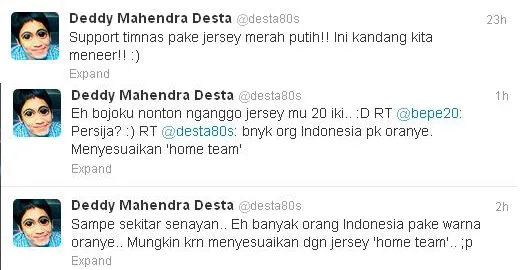 Tulisan tersebut mendapatkan tanggapan dari Bambang Pamungkas yang malam ini tidak turut bermain di squad Timnas Indonesia vs Belanda. Bepe dengan nada bercanda membalas bahwa mungkin saja suporter yang hadir malam ini mendukung tim 'home' dengan memakai jersey berwarna orange. Untuk diketahui, GBK juga adalah stadion home Persija Jakarta yang memakai jersey warna orange untuk laga home.
