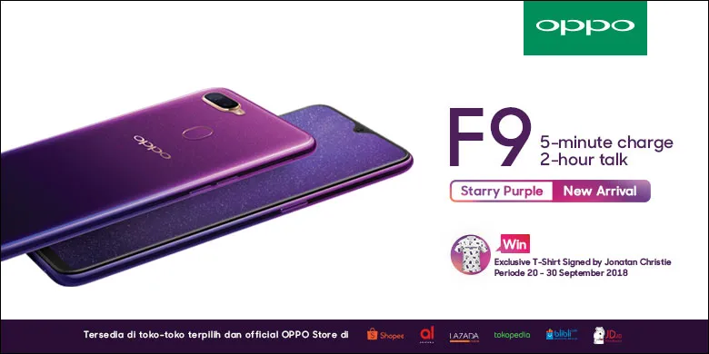 Eits, OPPO juga akan memberikan hadiah menarik bagi Anda yang membeli OPPO F9 Starry Purple pada periode 20-30 September, untuk menangkan Exclusive T-Shirt dengan tanda tangan Selfie Expert member terbaru OPPO Indonesia Jonatan Christie, untuk informasi lebih lanjut klik tautan ini.