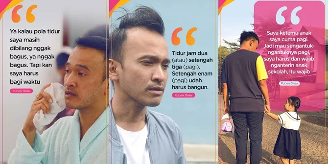 Ruben mengaku punya pola tidur yang berantakan. Bukan cuma disebabkan gara-gara pekerjaannya di dunia entertainment tapi juga karena rasa sayang kepada putri semata wayangnya, Thalia Putri Onsu. Suami Sarwendah ini mengaku tidur antara pukul 2 atau 2.30 pagi setiap harinya dan bangun tiga jam kemudian. "Saya harus bagi waktu. Soalnya saya ketemu anak saya cuma pagi. Jadi mau sengantuk-ngantuknya pagi, gua harus dan wajib nganterin anak sekolah, itu wajib. Karena itu pertemuan sama anak di jam enam sampe jam setengah delapan pagi. Jadi sengantuk-ngantuknya, setengah enam itu gua musti melek, udah siap," ceritanya.
