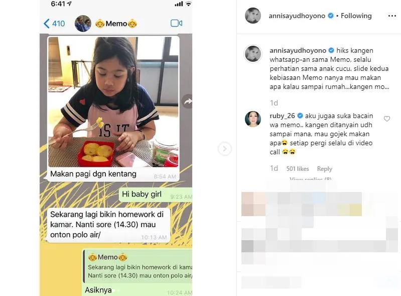 "Hiks kangen WhatsApp-an sama Memo, selalu perhatian sama anak cucu. Slide kedua kebiasaan Memo nanya mau makan apa kalau sampai rumah. Kangen Mo," ungkapnya.