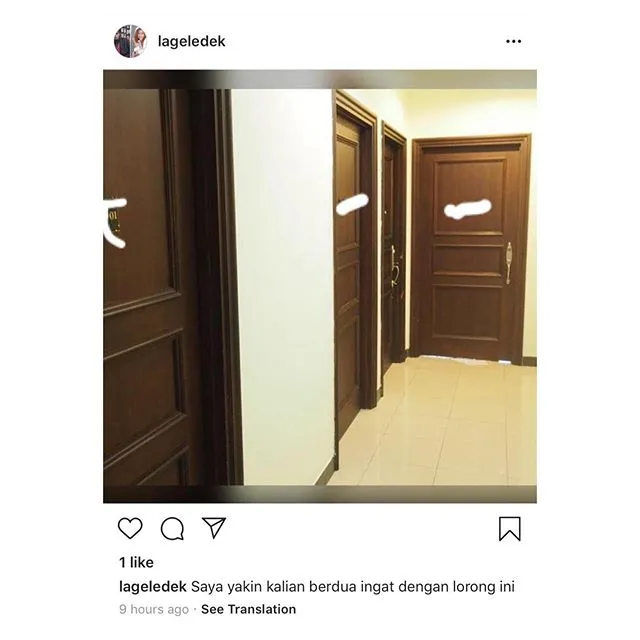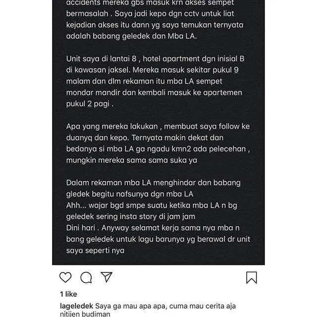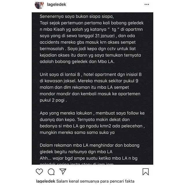 "Sebenarnya saya bukan siapa-siapa. Tapi sejak pertemuan pertama kali babang geledek n mba Kisah yang salah yang katanya 'tg' di apartemen saya yang disewa tanggal 31 Januari. Dan ada accidents mereka gak bisa masuk karena akses sempat bermasalah. Saya jadi kepo dengan cctv untuk lihat kejadian akses itu dan yang saya temukan ternyata adalah babang geledek dan mbak LA," tulis akun @lageledek.