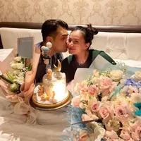 Di sampingnya berdiri Jonas Rivanno yang tampil casual dengan kemeja putih, celana jeans, dan sepatu sneakers. Aktor ganteng ini rupanya mencium mesra kening sang istri hingga netizen baper dibuatnya.
