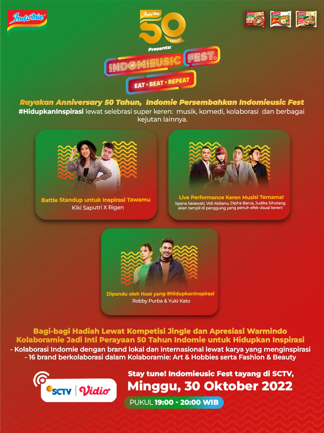 Nggak hanya setia menemani, Indomie akan selalu #HidupkanInspirasi lewat berbagai kejutan menariknya. So, jangan sampai ketinggalan kemeriahan gelaran Indomieusic Fest yang akan menghadirkan banyak inspirasi. Catat jadwalnya, Indomie Lovers!