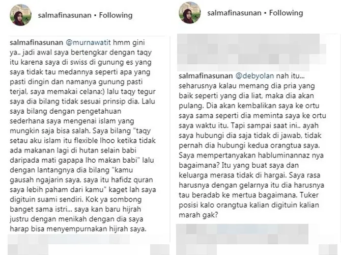 Terlibat selisih paham, Taqy yang saat itu merasa naik pitam langsung membantah pernyataan Salma. "Kamu nggak usah ngajarin saya! Saya itu Hafidz Quran, saya lebih pama dari kamu!" tulis Salma. Salma yang kaget dengan reaksi suaminya tersebut akhirnya menyayangkan sifat Taqy yang seolah menyombongkan diri.